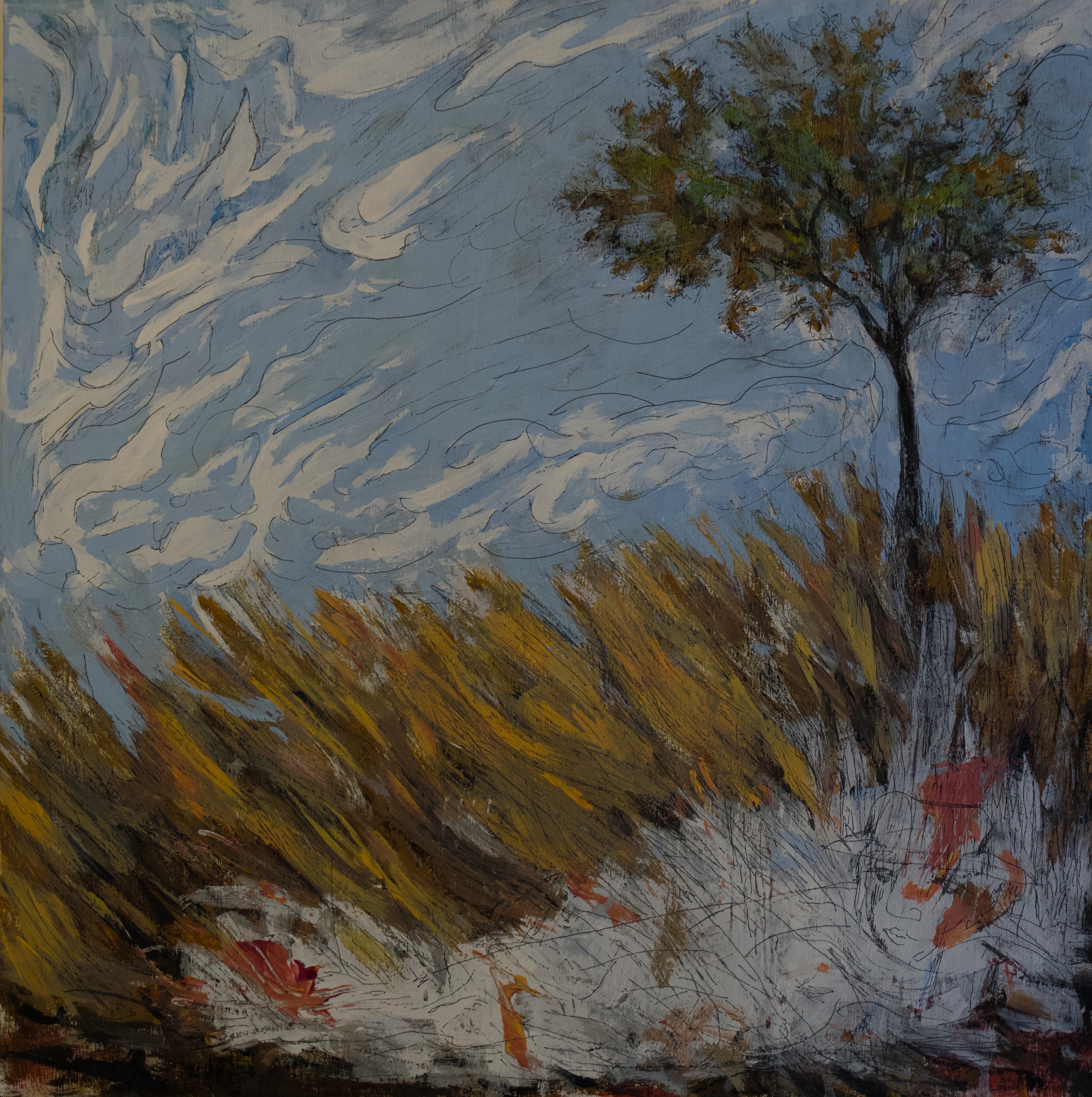 These are two panels from a broken camping table paired together. The artist, fidgeting in frustration with the work in progress. Trying to capture beauty, never quite getting it right.